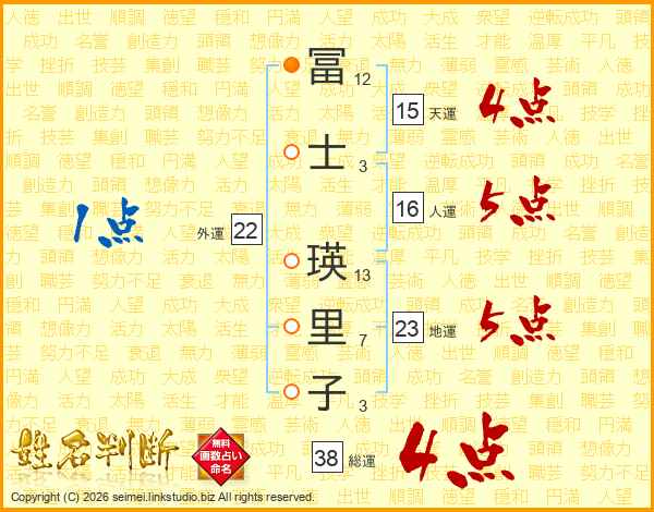 冨士瑛里子さんの総運は38画の4点!