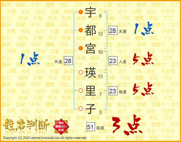 宇(6画)都(12画)宮(10画) 瑛(13画)里(7画)子(3画)