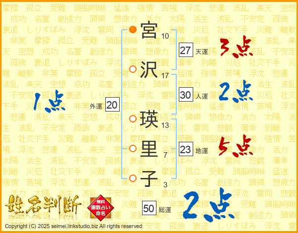 宮(10画)沢(17画) 瑛(13画)里(7画)子(3画)