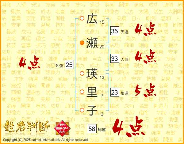 広(15画)瀬(20画) 瑛(13画)里(7画)子(3画)