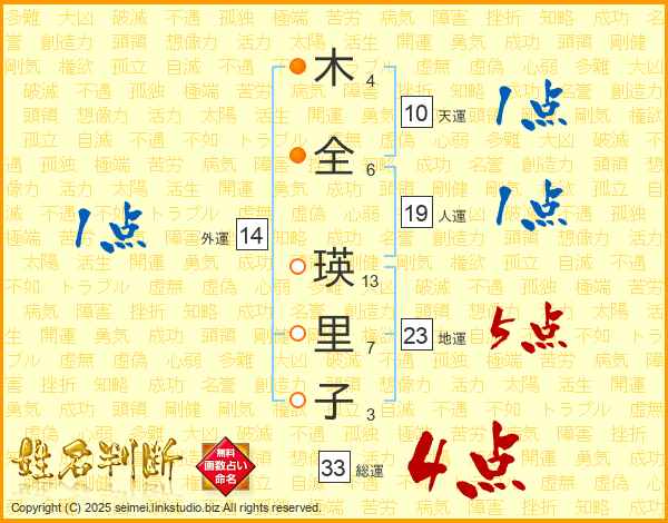 木(4画)全(6画) 瑛(13画)里(7画)子(3画)