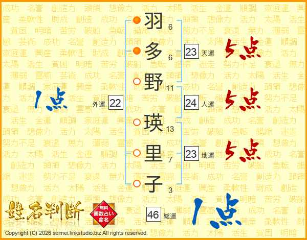 羽(6画)多(6画)野(11画) 瑛(13画)里(7画)子(3画)