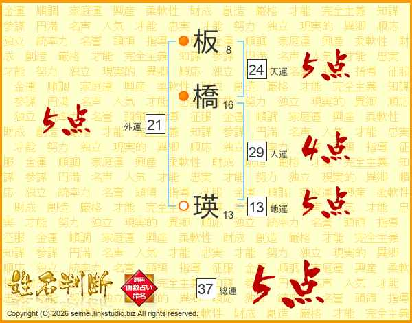 板(8画)橋(16画) 瑛(13画)