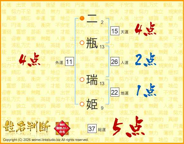 二(2画)瓶(13画) 瑞(13画)姫(9画)