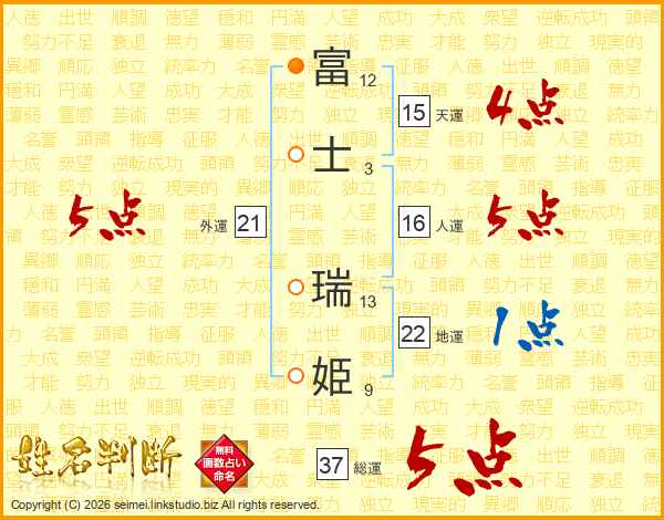富(12画)士(3画) 瑞(13画)姫(9画)