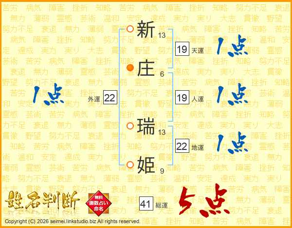 新(13画)庄(6画) 瑞(13画)姫(9画)