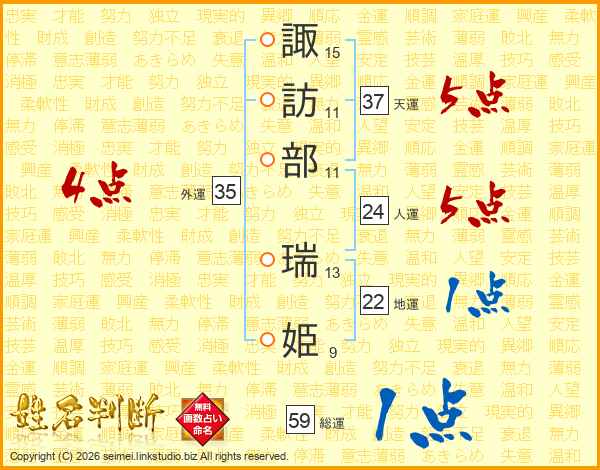 諏(15画)訪(11画)部(11画) 瑞(13画)姫(9画)