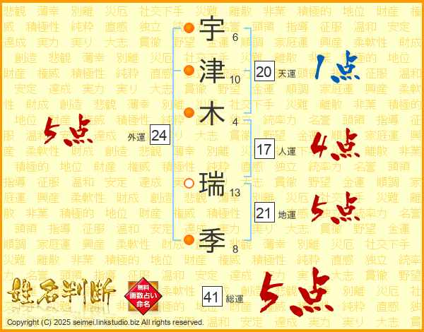 宇(6画)津(10画)木(4画) 瑞(13画)季(8画)
