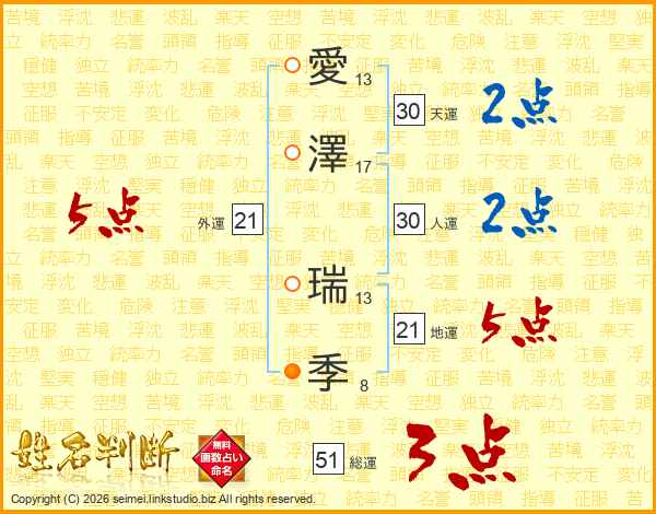 愛(13画)澤(17画) 瑞(13画)季(8画)