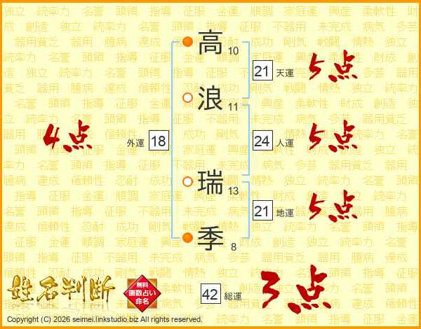 高(10画)浪(11画) 瑞(13画)季(8画)