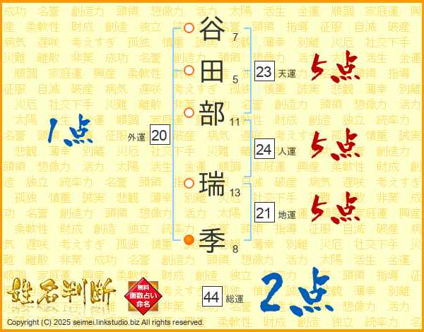 谷(7画)田(5画)部(11画) 瑞(13画)季(8画)