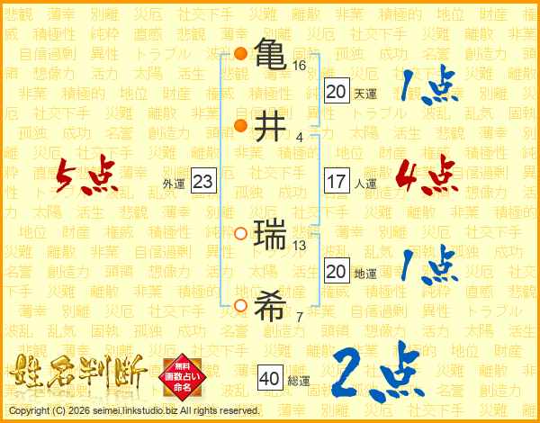 亀(16画)井(4画) 瑞(13画)希(7画)