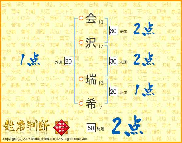 会(13画)沢(17画) 瑞(13画)希(7画)