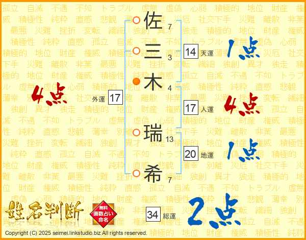 佐(7画)三(3画)木(4画) 瑞(13画)希(7画)