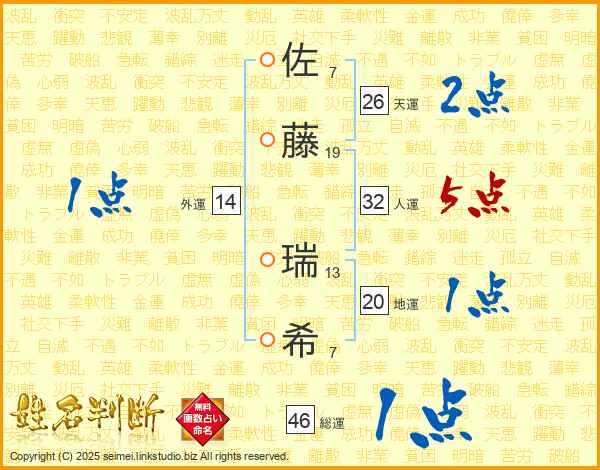 佐(7画)藤(19画) 瑞(13画)希(7画)
