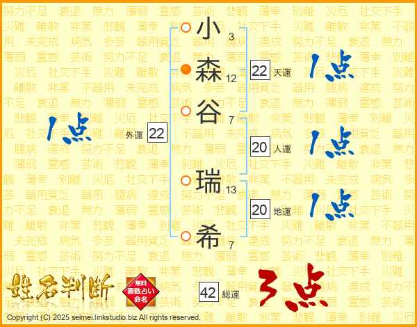 小(3画)森(12画)谷(7画) 瑞(13画)希(7画)
