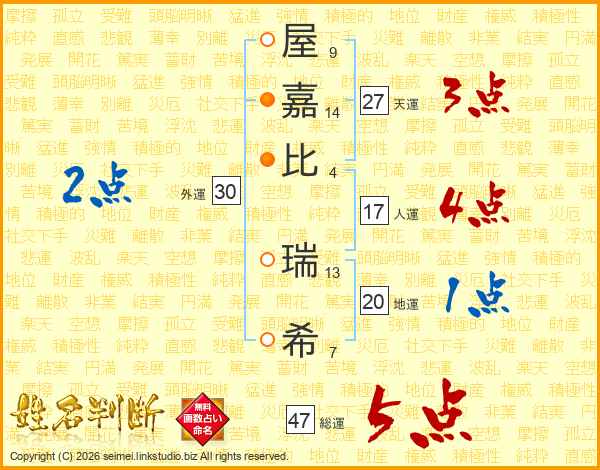 屋(9画)嘉(14画)比(4画) 瑞(13画)希(7画)