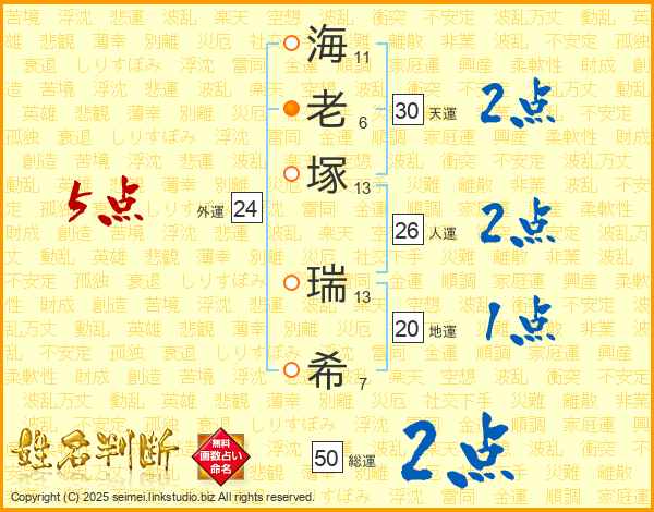 海(11画)老(6画)塚(13画) 瑞(13画)希(7画)