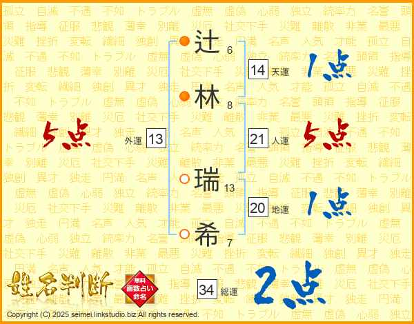 辻(6画)林(8画) 瑞(13画)希(7画)