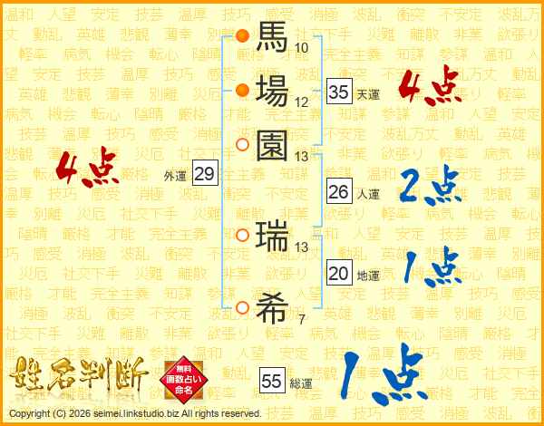 馬(10画)場(12画)園(13画) 瑞(13画)希(7画)