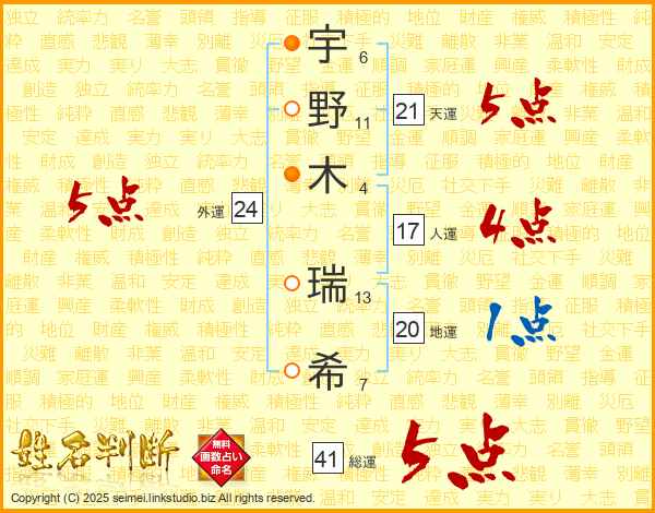 宇野木瑞希さんの総運は41画の5点!