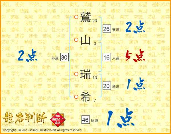 鷲(23画)山(3画) 瑞(13画)希(7画)