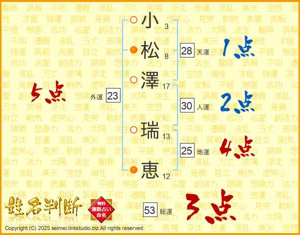 小(3画)松(8画)澤(17画) 瑞(13画)恵(12画)