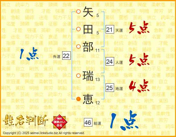矢(5画)田(5画)部(11画) 瑞(13画)恵(12画)