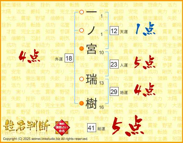 一(1画)ノ(1画)宮(10画) 瑞(13画)樹(16画)
