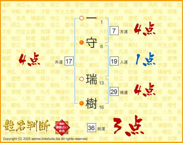 一(1画)守(6画) 瑞(13画)樹(16画)