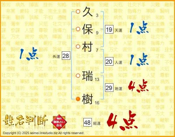 久(3画)保(9画)村(7画) 瑞(13画)樹(16画)