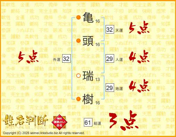 亀(16画)頭(16画) 瑞(13画)樹(16画)