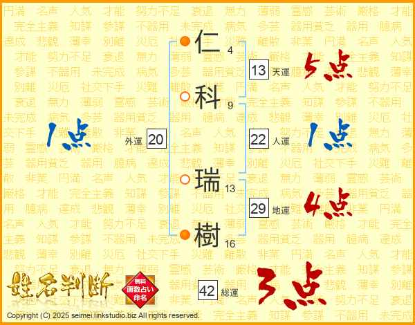 仁(4画)科(9画) 瑞(13画)樹(16画)