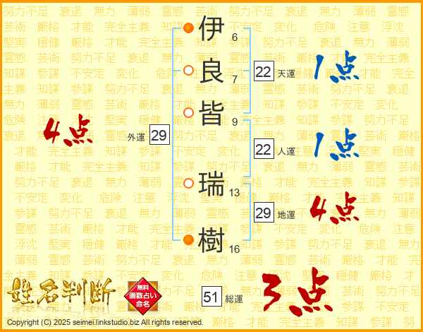 伊(6画)良(7画)皆(9画) 瑞(13画)樹(16画)