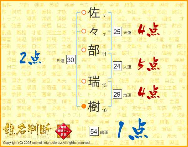 佐(7画)々(7画)部(11画) 瑞(13画)樹(16画)