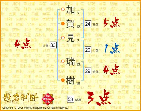 加(5画)賀(12画)見(7画) 瑞(13画)樹(16画)