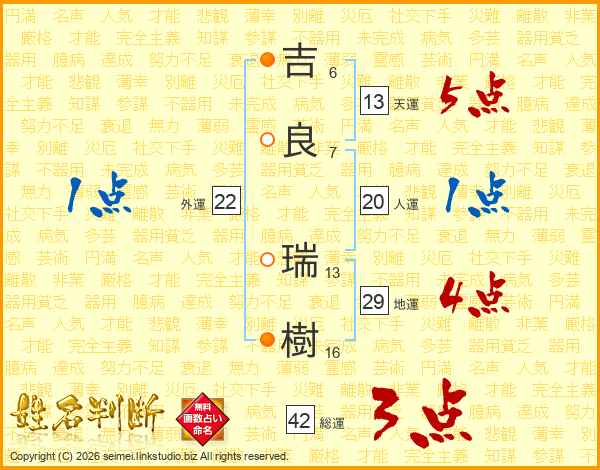 吉(6画)良(7画) 瑞(13画)樹(16画)