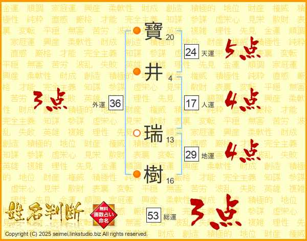 寶(20画)井(4画) 瑞(13画)樹(16画)