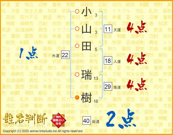 小(3画)山(3画)田(5画) 瑞(13画)樹(16画)