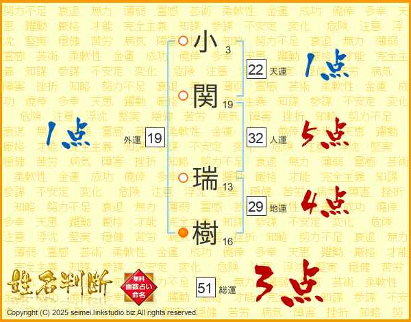小(3画)関(19画) 瑞(13画)樹(16画)
