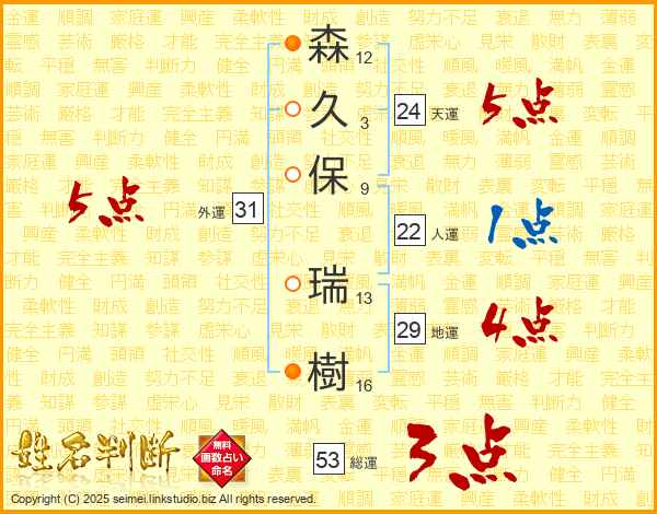 森(12画)久(3画)保(9画) 瑞(13画)樹(16画)