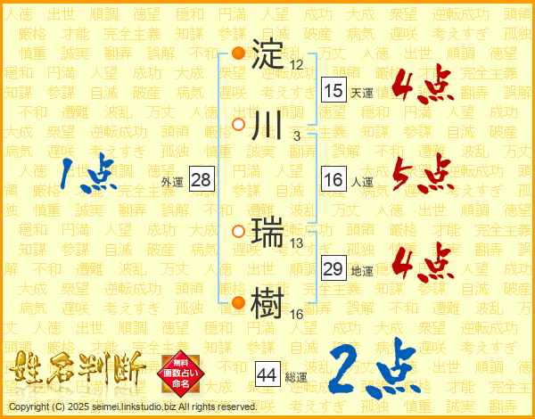 淀(12画)川(3画) 瑞(13画)樹(16画)