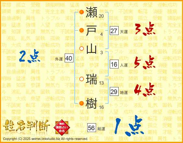 瀬(20画)戸(4画)山(3画) 瑞(13画)樹(16画)