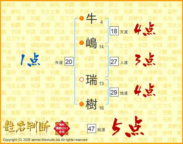 牛(4画)嶋(14画) 瑞(13画)樹(16画)