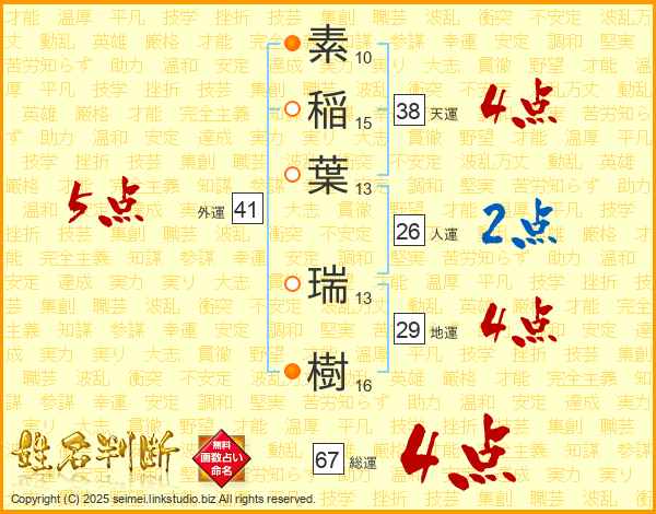 素(10画)稲(15画)葉(13画)  瑞(13画)樹(16画)