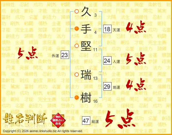 久(3画)手(4画)堅(11画) 瑞(13画)樹(16画)