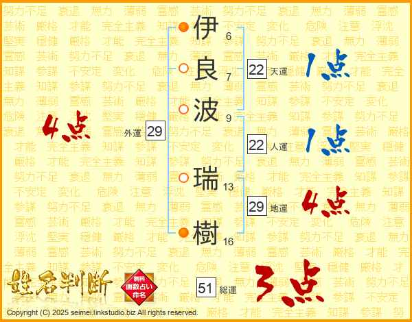 伊(6画)良(7画)波(9画) 瑞(13画)樹(16画)