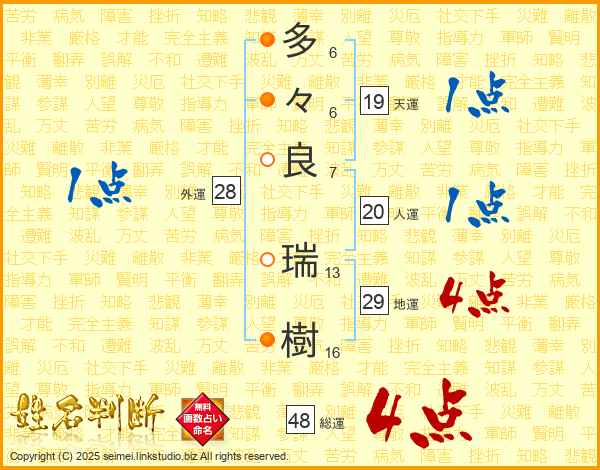 多(6画)々(6画)良(7画) 瑞(13画)樹(16画)