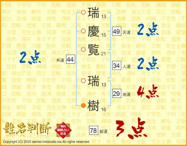 瑞(13画)慶(15画)覧(21画) 瑞(13画)樹(16画)