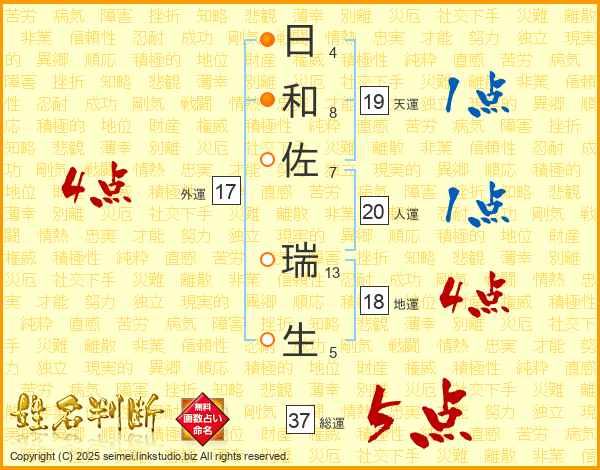 日(4画)和(8画)佐(7画) 瑞(13画)生(5画)